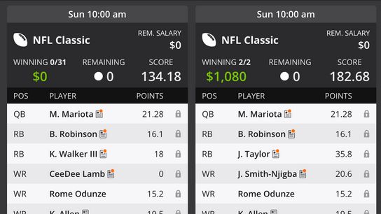 JSN had volume concerns given the likely game-script (proven true!), and THE BLITZ projected Kenneth Walker as the slate’s literal RB1 with Zach Charbonnet out. So, I switched out Taylor, JSN and Jake Ferguson for CeeDee Lamb, K9 and Juwan Johnson in 94% of my lineups Sunday morning. To be clear, these were my only entries during this slate, and I play a high number of “winner take alls,” so it was easy to compare how much the gaffe cost me.