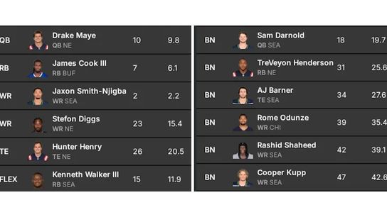It's probably dead on arrival, yes. That's how these contests work. Still, it would be a fine looking squad if Seattle and New England were to actually survive the next two rounds. Cook and Odunze are on board to help the lineup advance to next week. (Also, in my NE-SEA scenario, each of them is capable of giving me two games.)
